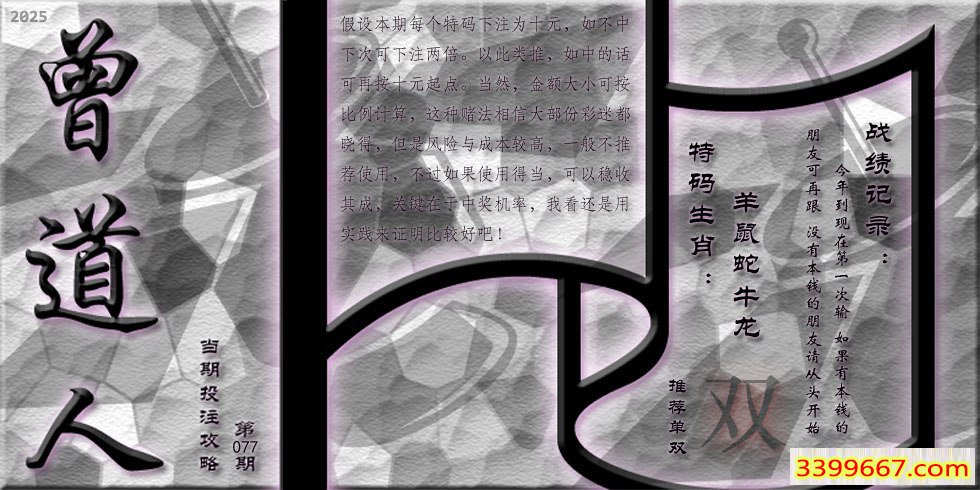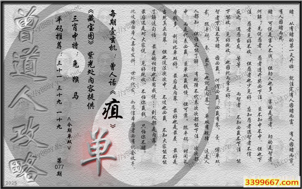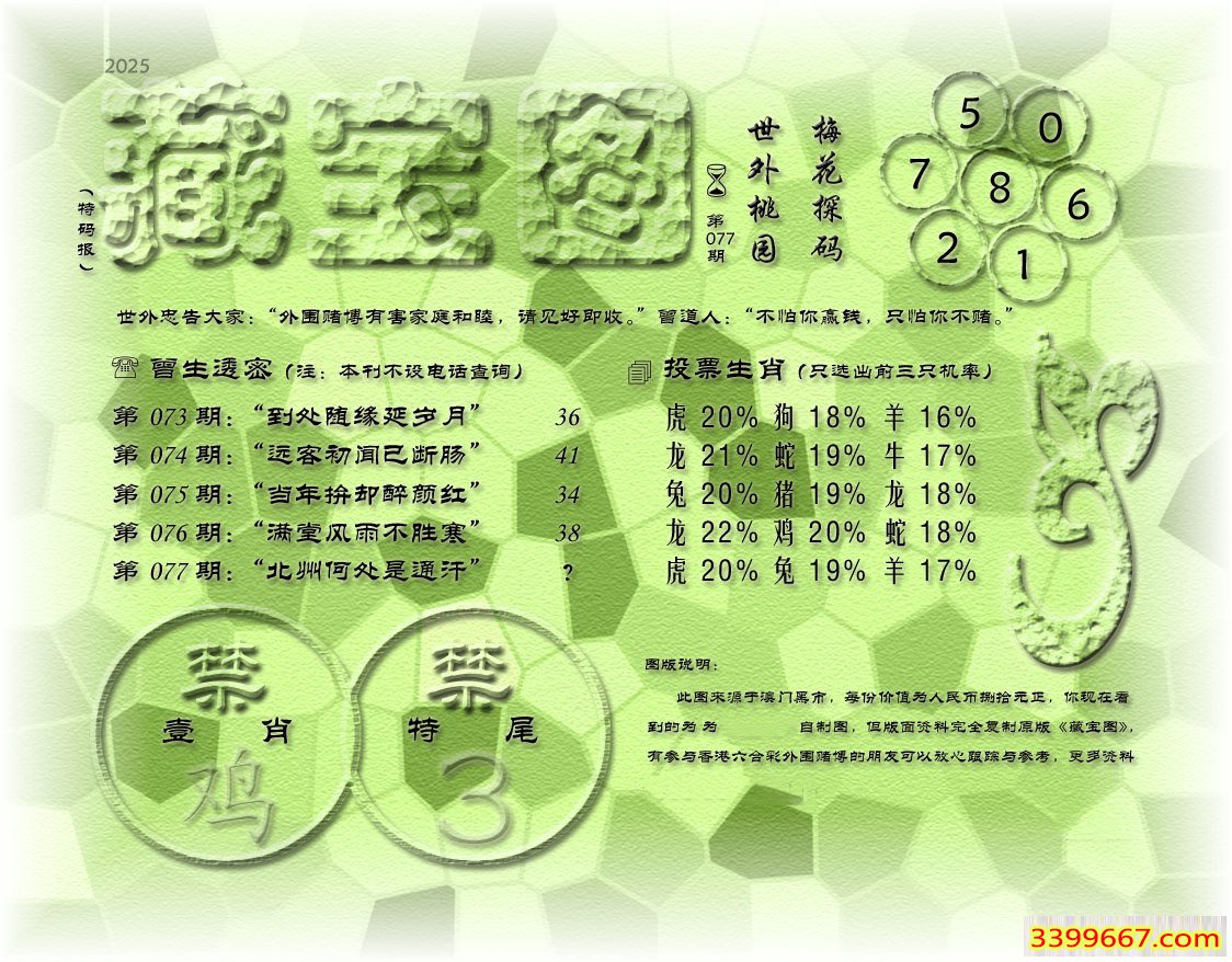 | 主题 :077期藏寶圖 新:自笑未曾同逸步 老:北州何处是通汗 禁:鸡 禁:3尾 |