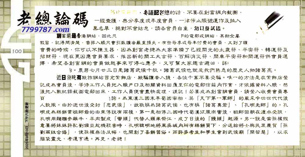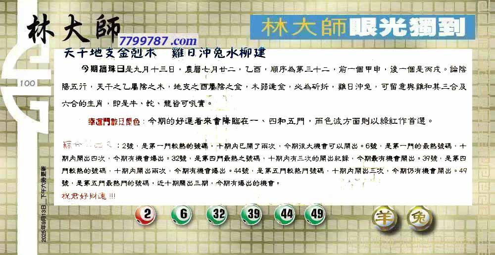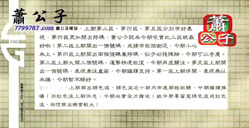 | 主题 :100期:六合皇金句/老总论码/萧公子/林大师/五行夺码/老总信箱截 |