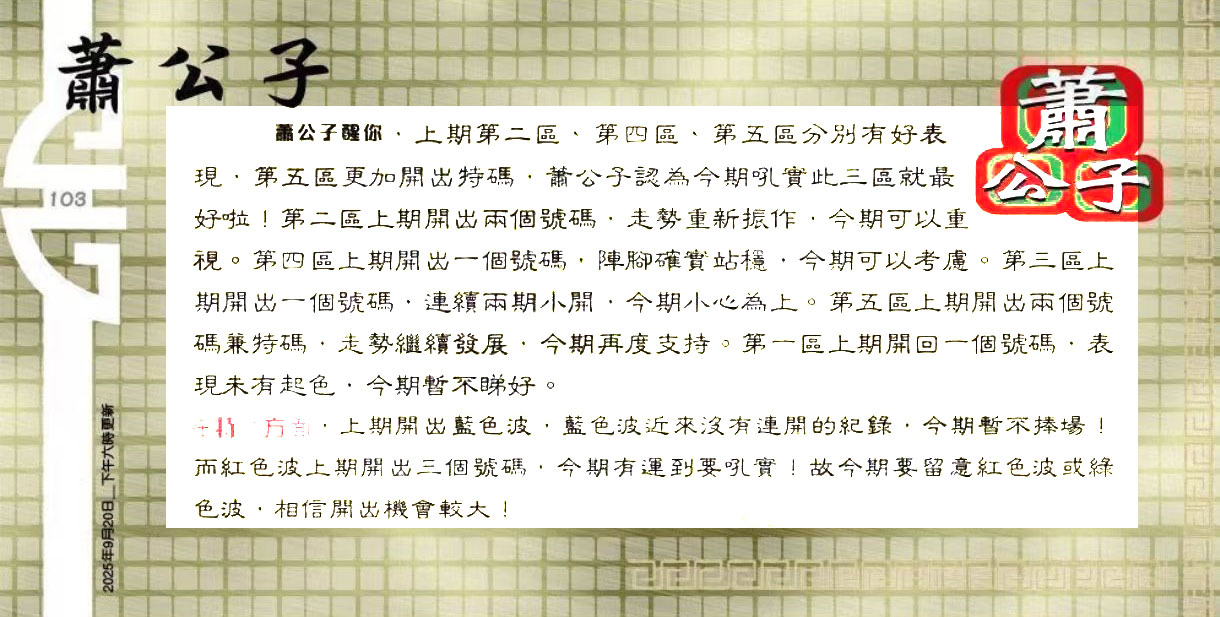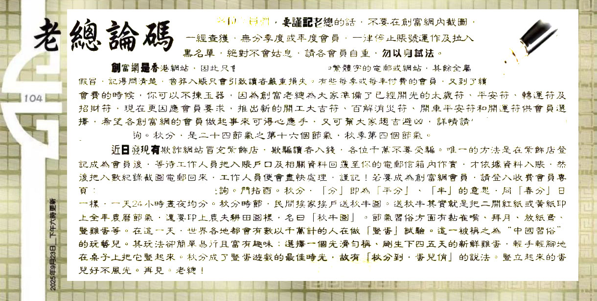 | 主题 :104期:六合皇金句/老总论码/萧公子/林大师/五行夺码/老总信箱截 |