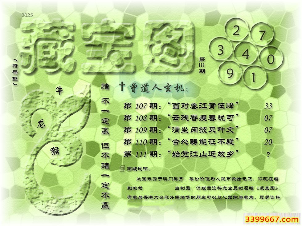 | 主题 :111期藏寶圖 新:始觉江山近故乡 老:曲阑干外天如水 禁:兔 禁:6尾 |